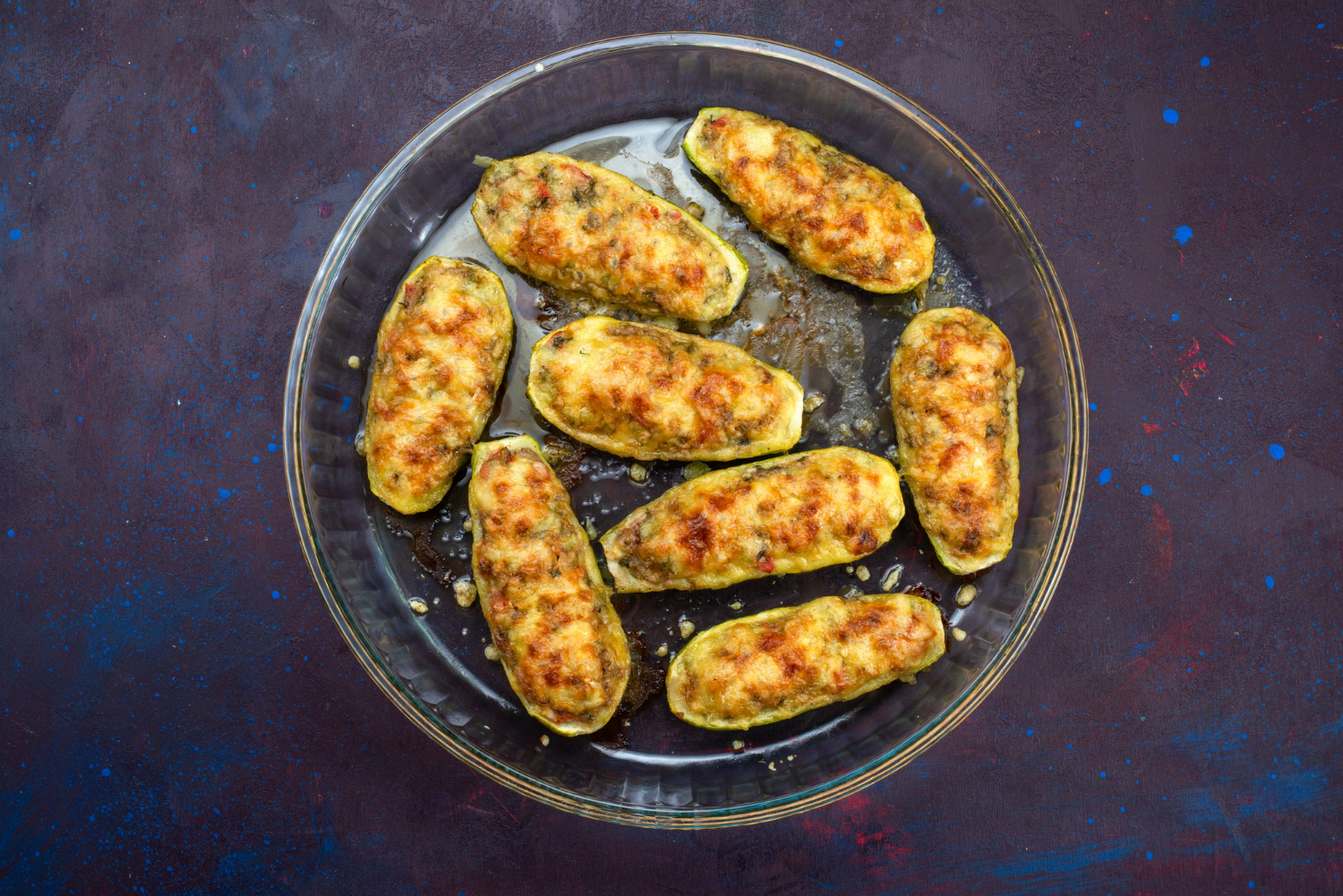- Nadziewanie (3 min): ułóż cukinie w naczyniu, nałóż farsz, polej ponad połową sosu.